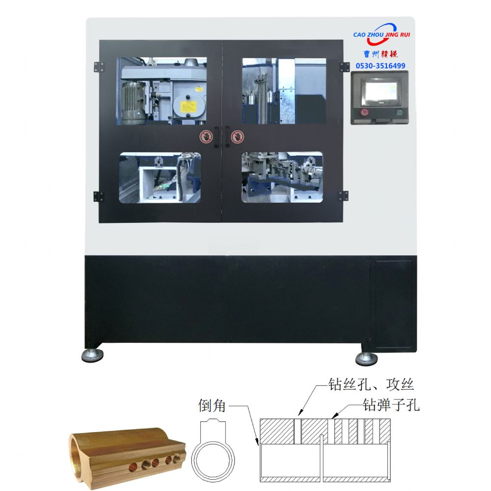 自动进料、钻弹子孔、钻丝孔、倒角、攻丝、自动落料