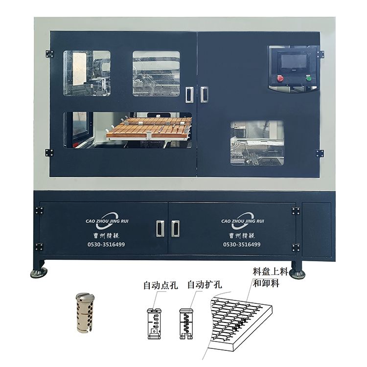 ·料盘进料、机械手上料、点孔/扩孔、卸料摆盘。